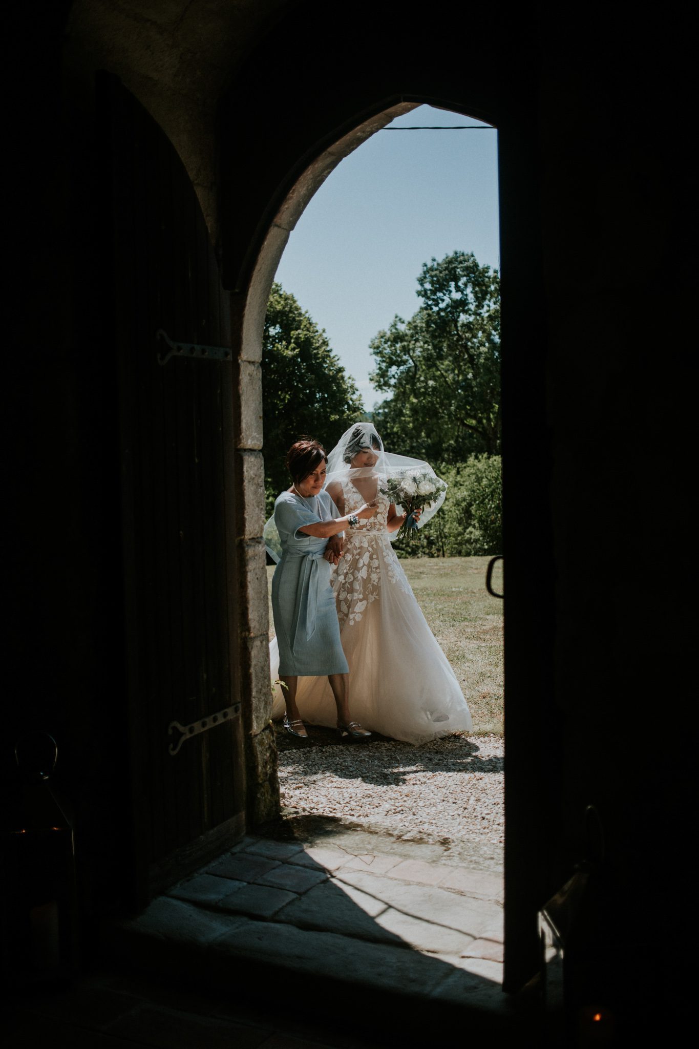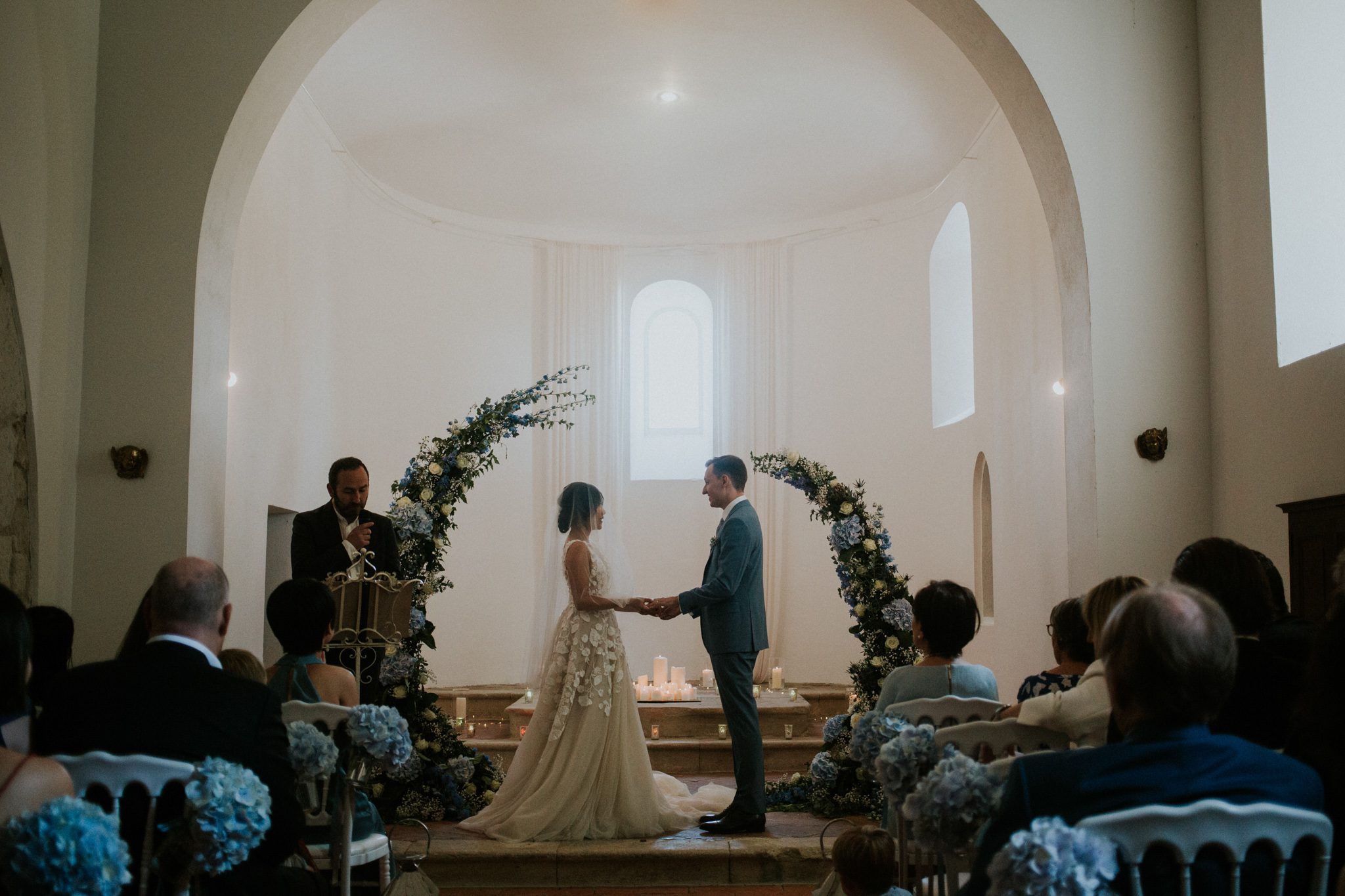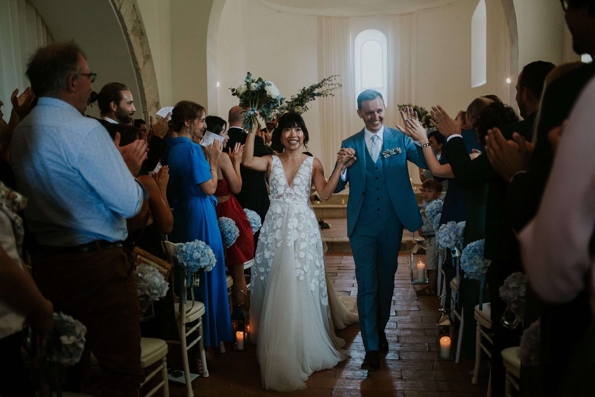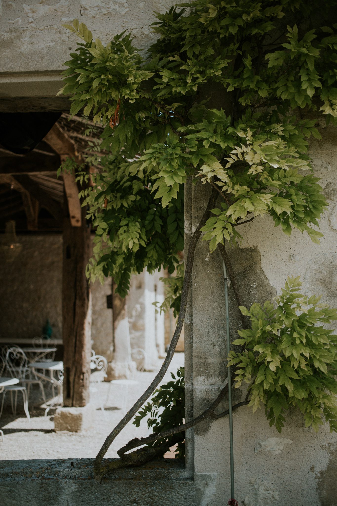If I were to picture the perfect chateau wedding, this would come close. And it’s slightly in the little details. The waterfalls of wisteria. The fields of sunflowers, nodding drowsily in the breeze. Dinner held in a centuries old barn, and in the floor tiles there are the unmistakable imrints from a cat’s paw. the cat in question is hundreds of years gone but her legacy of tiny cat vandalism very much remains. The chapel interior is whitewashed – helping keep things cool while affording a flexible canvas for a ceremony